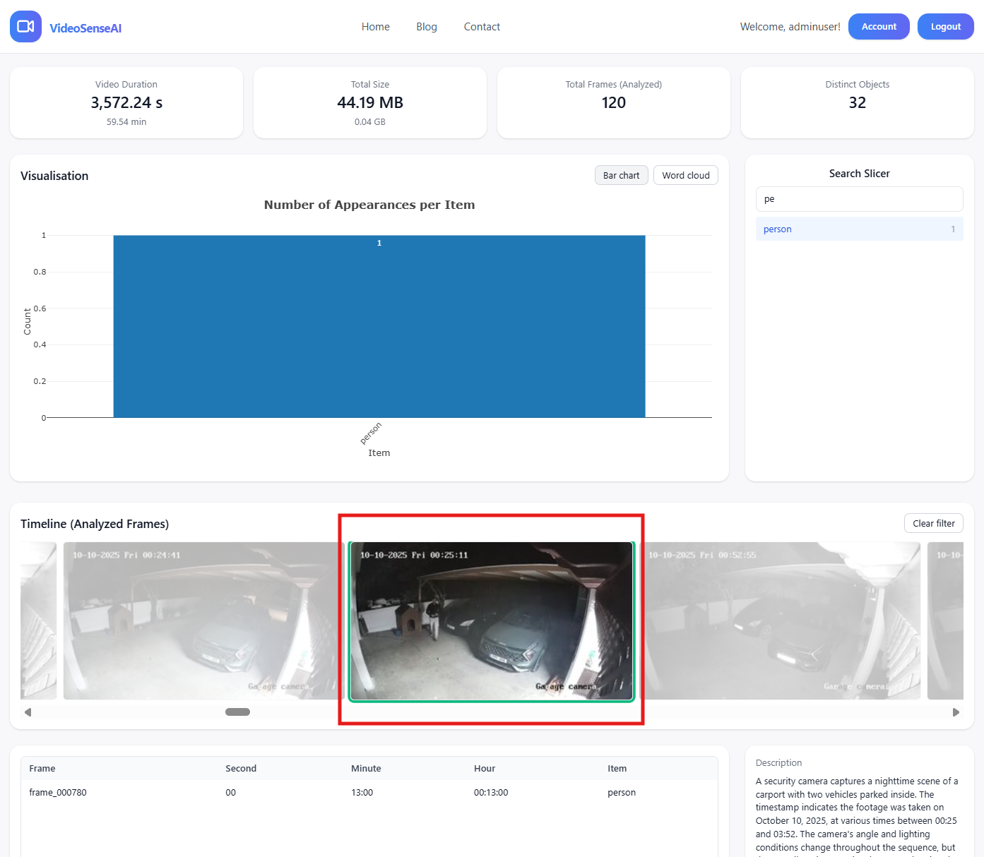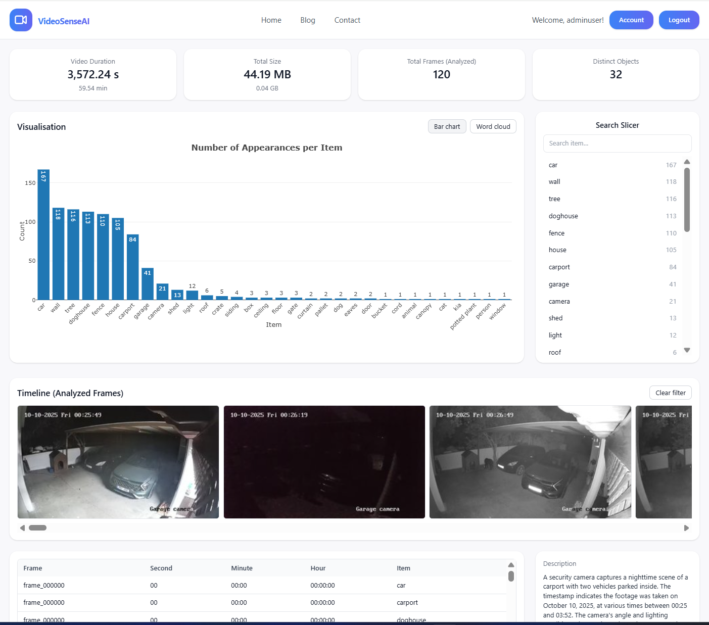 The AI analyzed the entire video — 120 frames from 3,572 seconds — in under 1 minutes. From over 32 object types detected (car, wall, dog, tree, fence, house, etc.), the system pinpointed the exact frame where a person appeared — potentially identifying a thief or intruder.