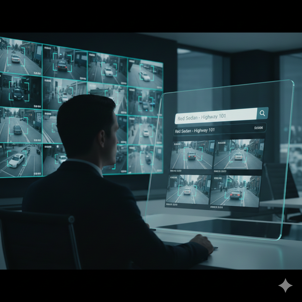 Instead of reviewing hours of footage per camera, a searchable system allows investigators to query for “red car” across the archive.
