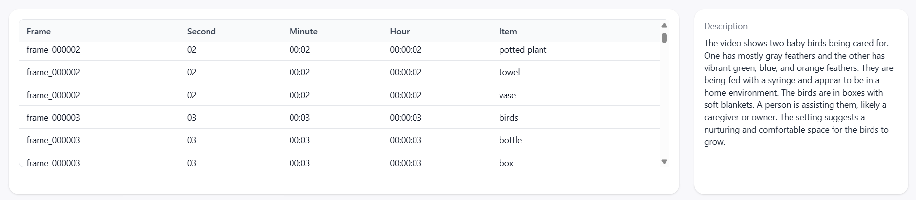 Instead of remaining an unstructured file, the video is converted into a relational dataset with timestamp-level granularity.