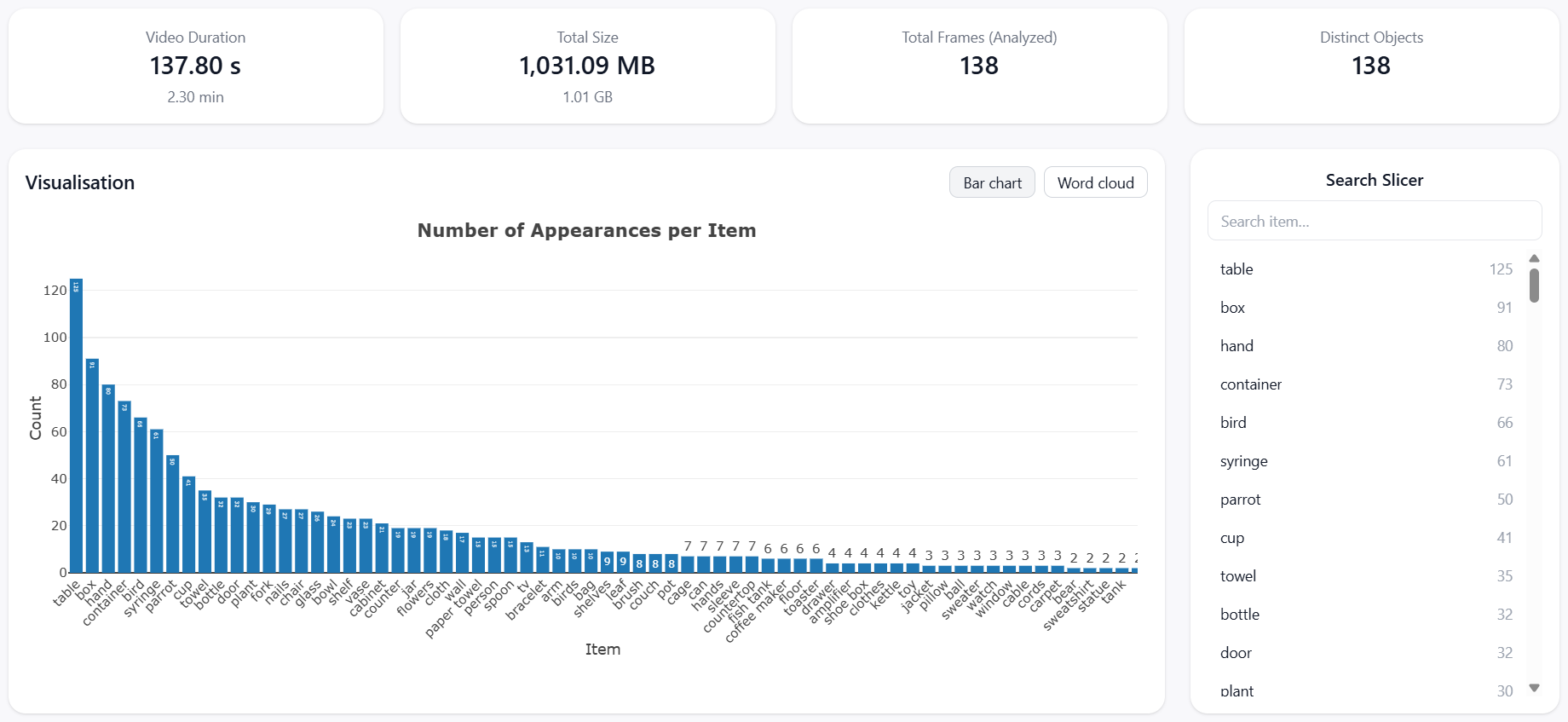 - Bar charts showing object frequency across the full video duration
