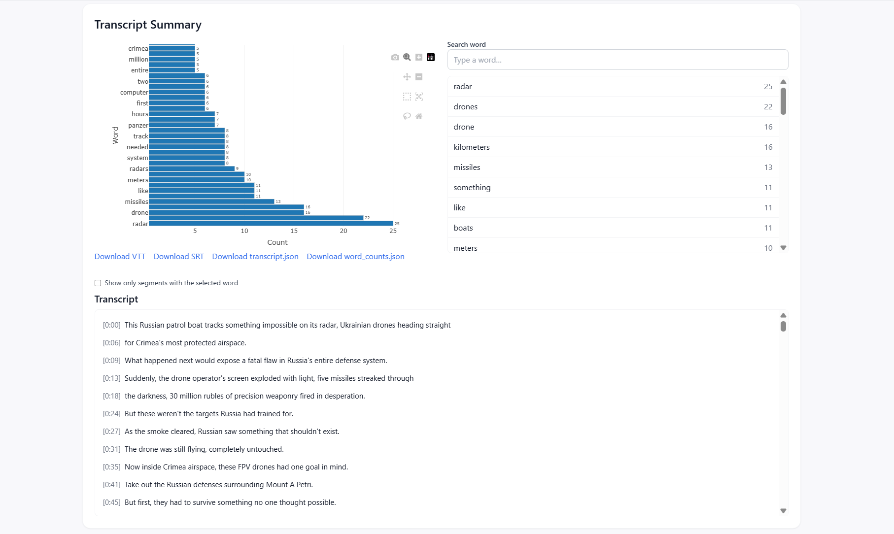 If your video contains speech, VideoSenseAI can generate a timestamped transcript that is fully searchable.